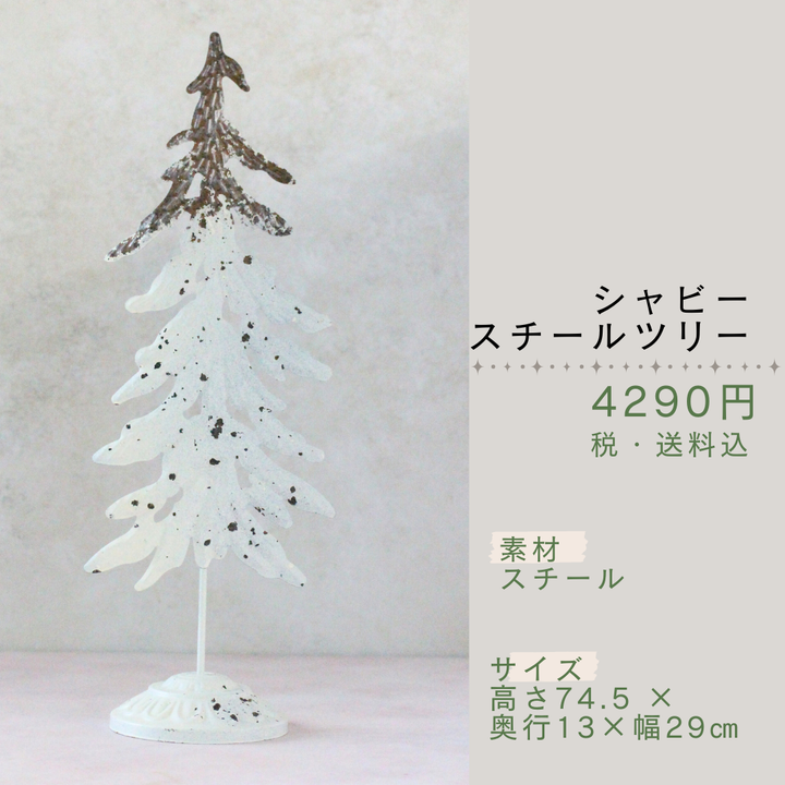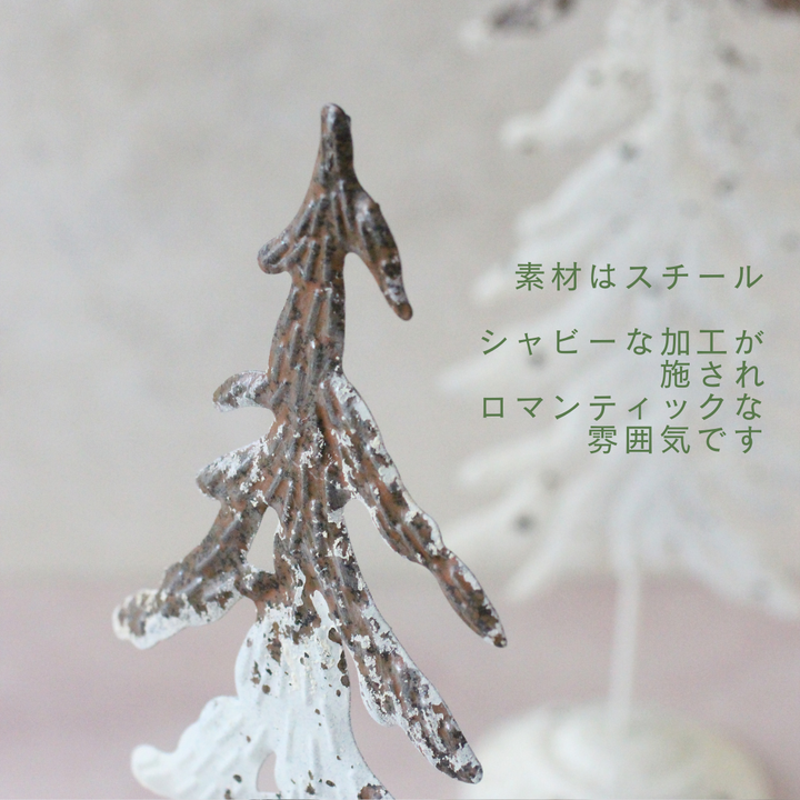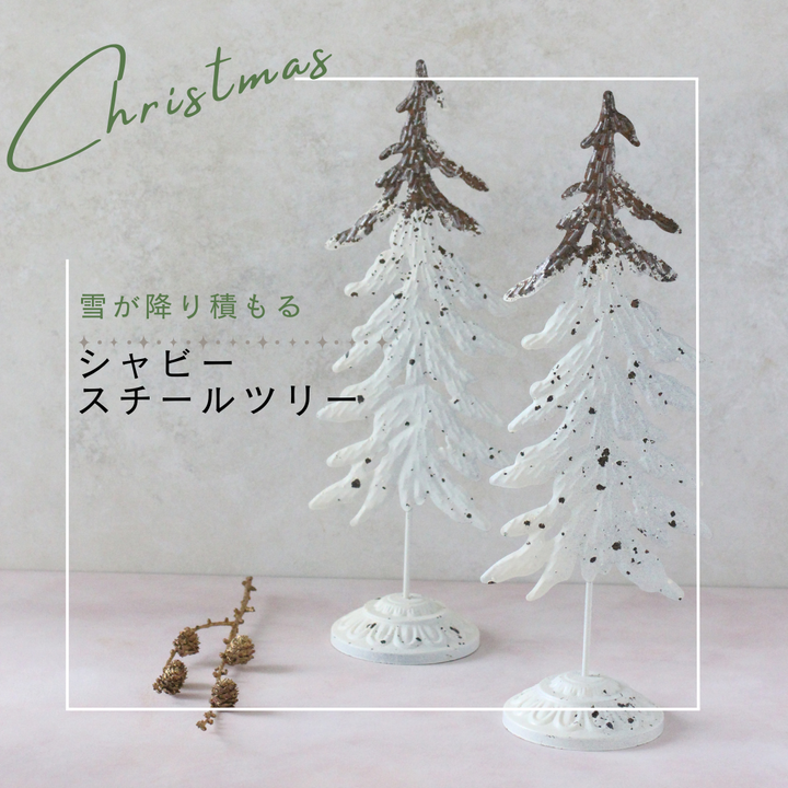 人気ショップ「コベントガーデン」のシャビースチールツリーは、深い森の中に、雪を抱いたモミの木を思わせます。
