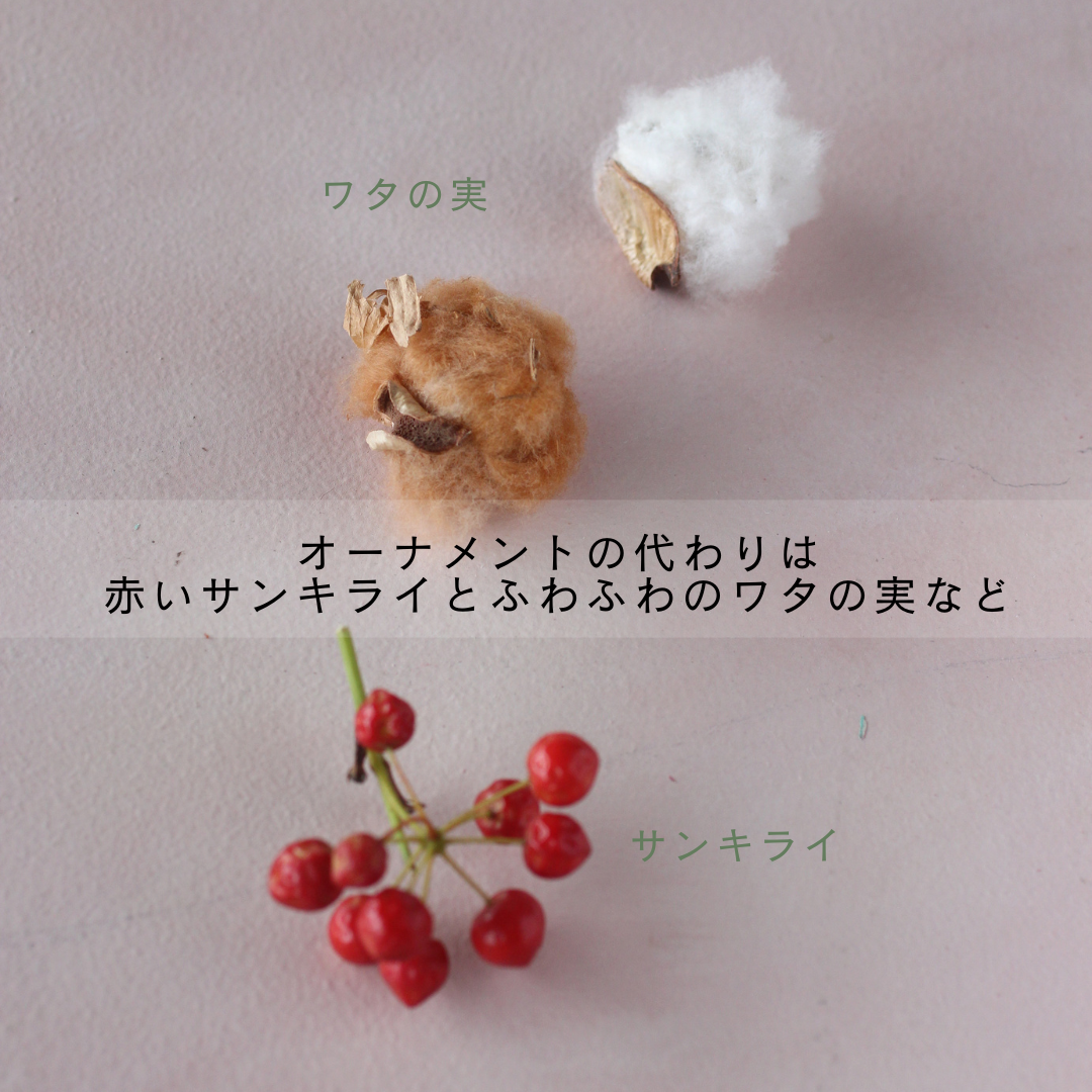 オーナメントの代わりは小さな実ものたち。赤く、つやつやのサンキライや、ふわふわのワタなどでクリスマスカラーをナチュラルに描きます。
