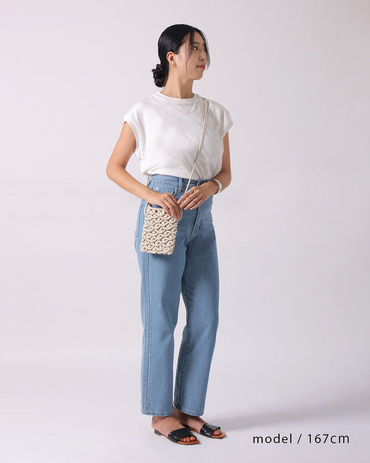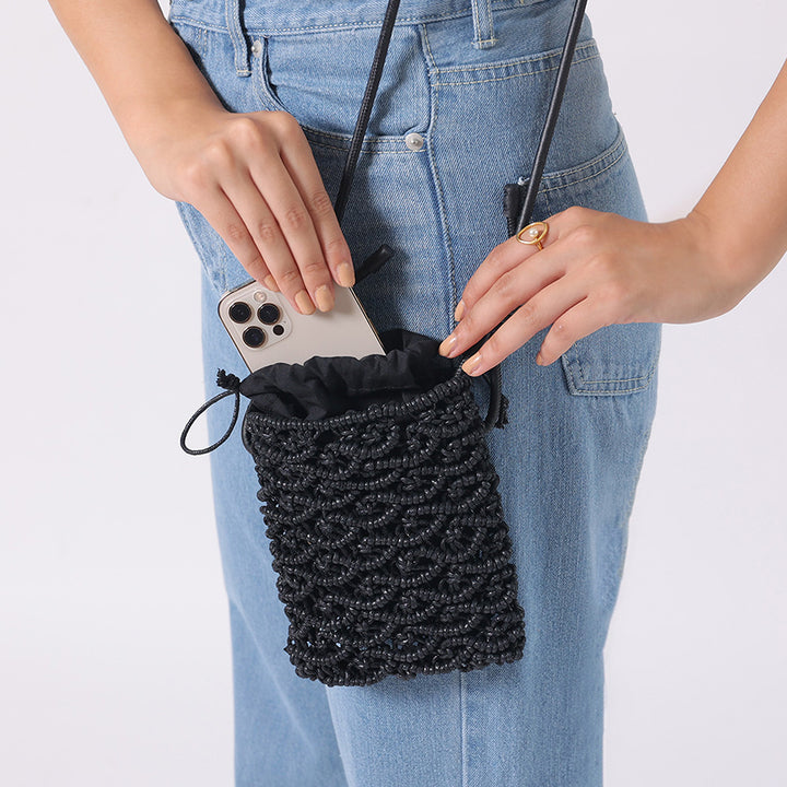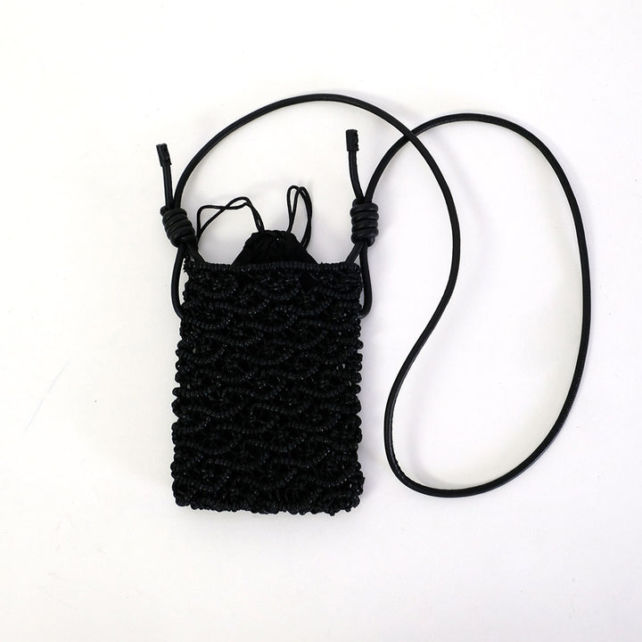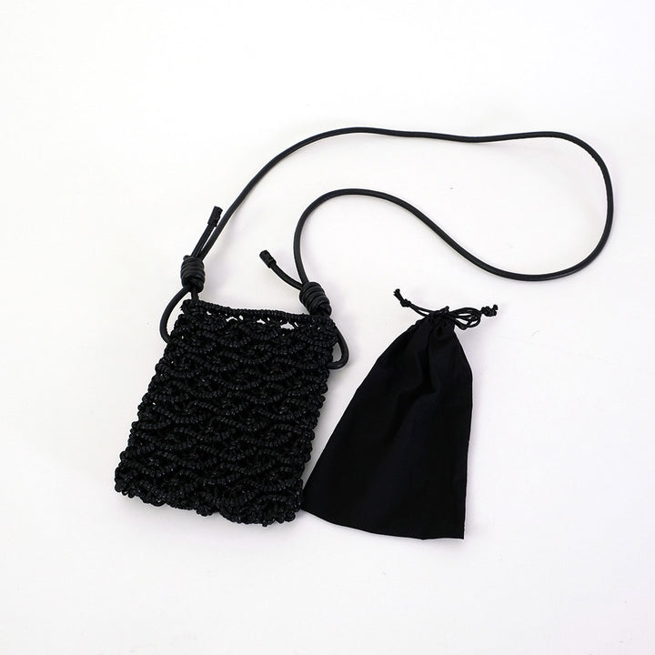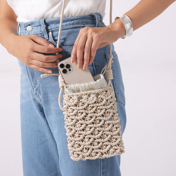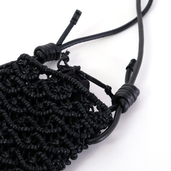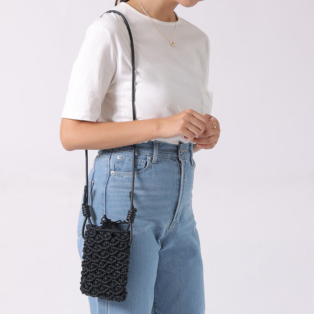 そんな時にぴったりのアイテムがマクラメショルダーバッグ。密な編み地とフェイクレザーの巻きコードが高見えするミニショルダー。スマホが丁度入る大きさです。