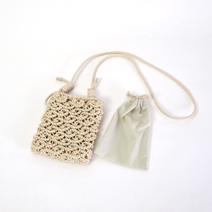 マクラメ編みのバッグの中には、巾着のポーチをセットして使用します。巾着なので、口元をしぼるだけで、物の出し入れも簡単です。